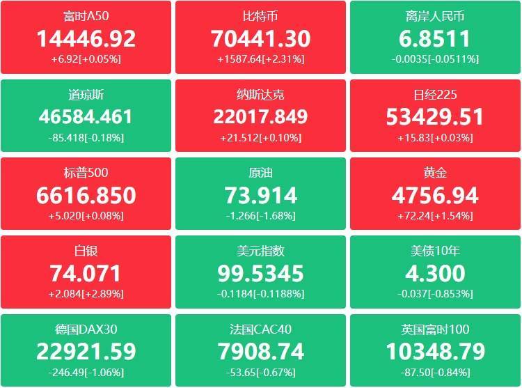 期货:现货黄金涨1.30%报4709.73美元,黄金期货涨1.11%报4737.80美元;现货白银涨0.28%报73.0205美元,白银期货涨0.48%报73.195美元;铜期货持平报5.5995美元,现货铂金跌0.98%,现货钯金跌0.79%;原油期货收涨0.54美元,涨幅0.48%报112.95美元;布伦特原油跌0.50美元,跌幅超0.45%报109.27美元;天然气期货报2.87美元,汽油期货报3.3052美元,取暖油期货报4.4774美元。